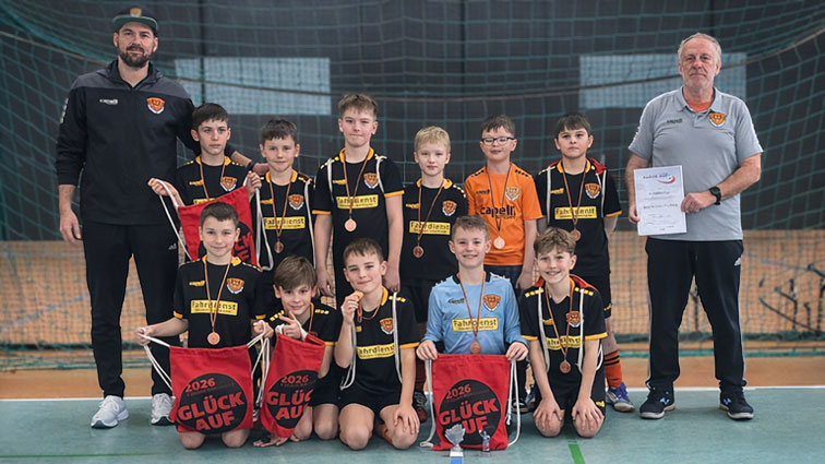 Nach einer starken Gruppenphase und dem Einzug in die Finalrunde gelang der Sprung ins Halbfinale. Dort mussten wir uns zwar Carl Zeiss Jena geschlagen geben, zeigten aber auch in diesem Spiel eine couragierte Leistung. Im Spiel um Platz 3 lieferten sich unsere Kinder anschließend ein intensives Duell mit Erzgebirge Aue, mussten sich jedoch knapp geschlagen geben.