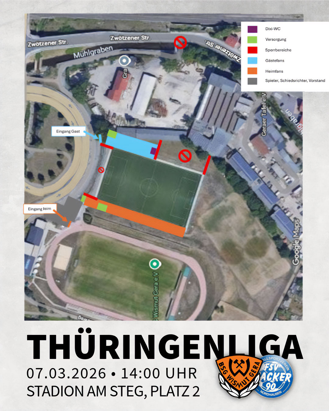 Am Samstag findet das Thüringenligaspiel BSG Wismut Gera gegen den FSV Wacker 90 Nordhausen im Stadion am Steg statt. Gespielt wird auf unserem Kunstrasenplatz. Aufgrund der Vorkommnisse in der Vergangenheit besteht für diese Begegnung ein erhöhter Sicherheitsbedarf. Aus diesem Grund wird pro Ticket ein Sicherheitszuschlag in Höhe von 2,00 Euro erhoben. Diese Entscheidung ist uns nicht leichtgefallen, ist jedoch zur Umsetzung der notwendigen Sicherheitsmaßnahmen erforderlich.