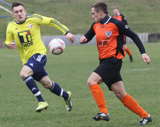 Marcel Lange (re.) setzt im Mittelfeld gegen den Leinefelder Martin Wiederhold zum Solo an. - Foto: Jens Lohse
